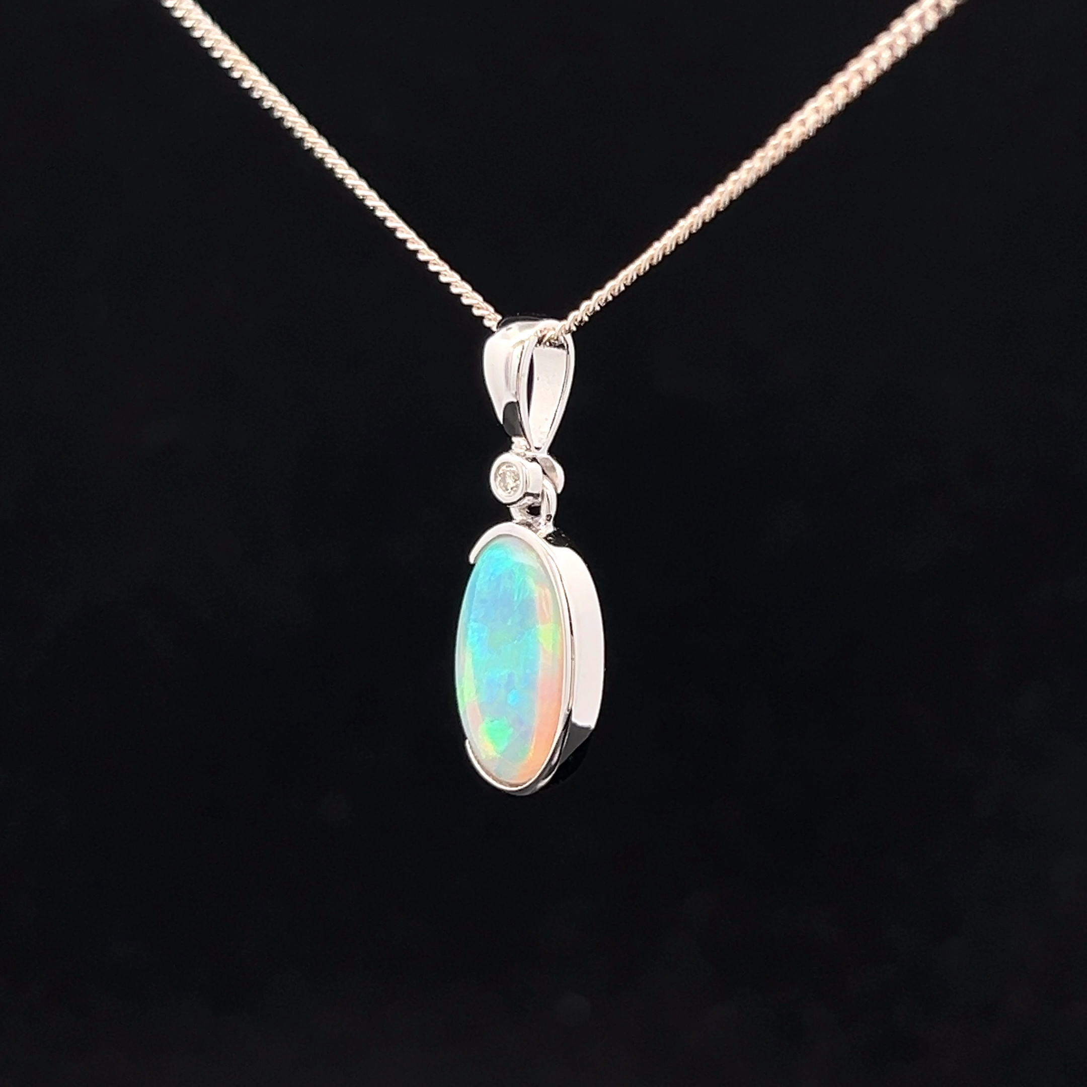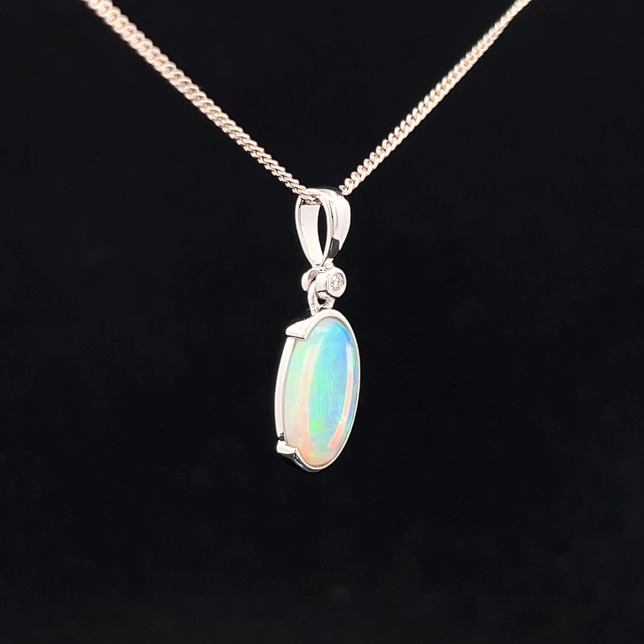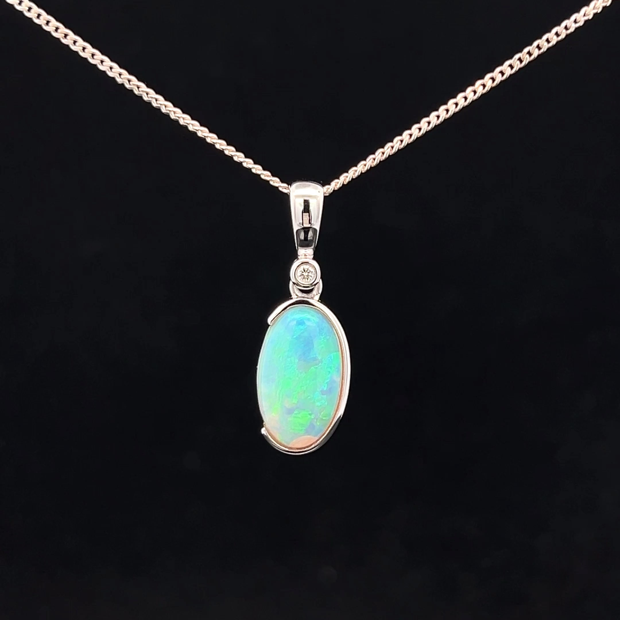 South Australian Solid Crystal Opal and Diamond set in 14k White Gold Pendant