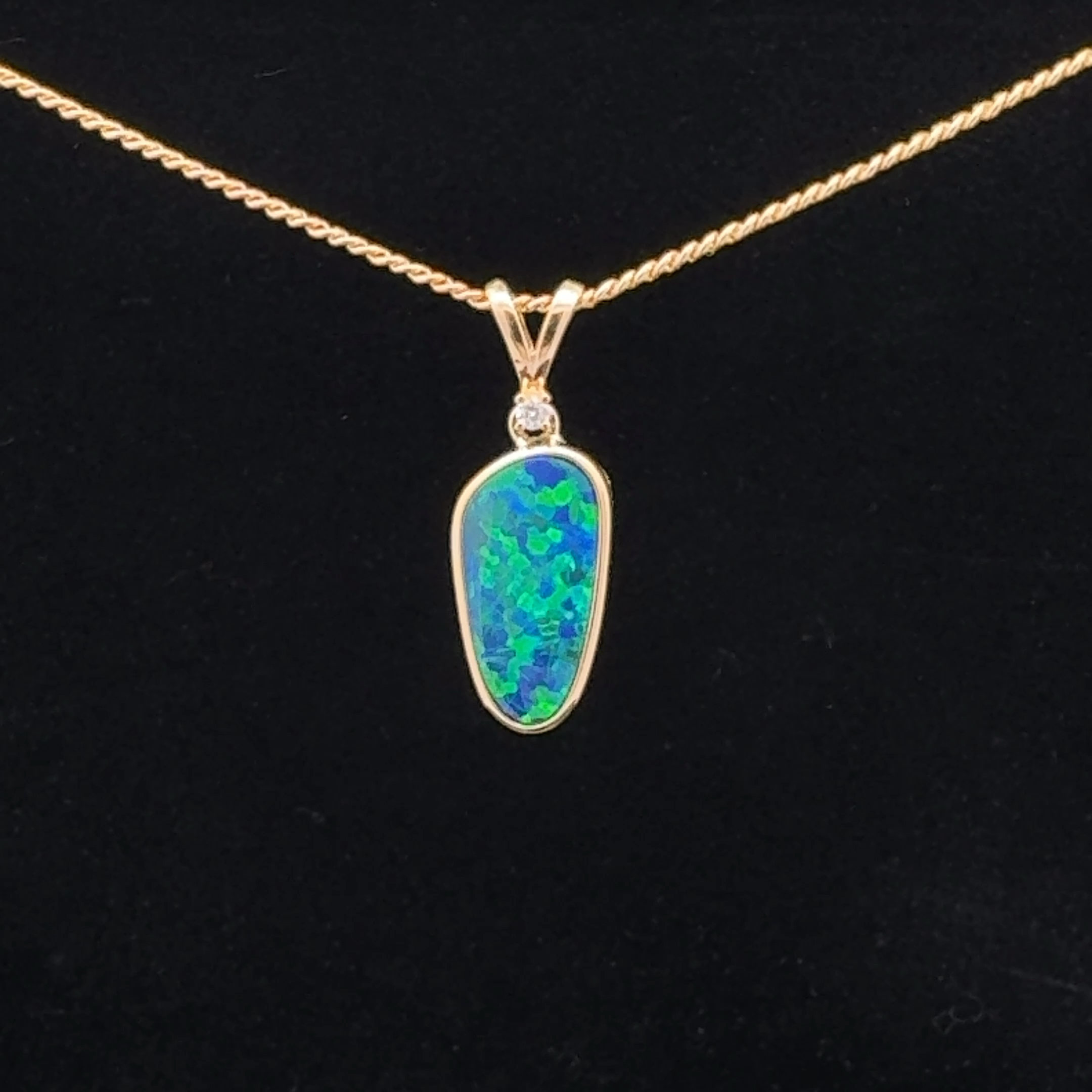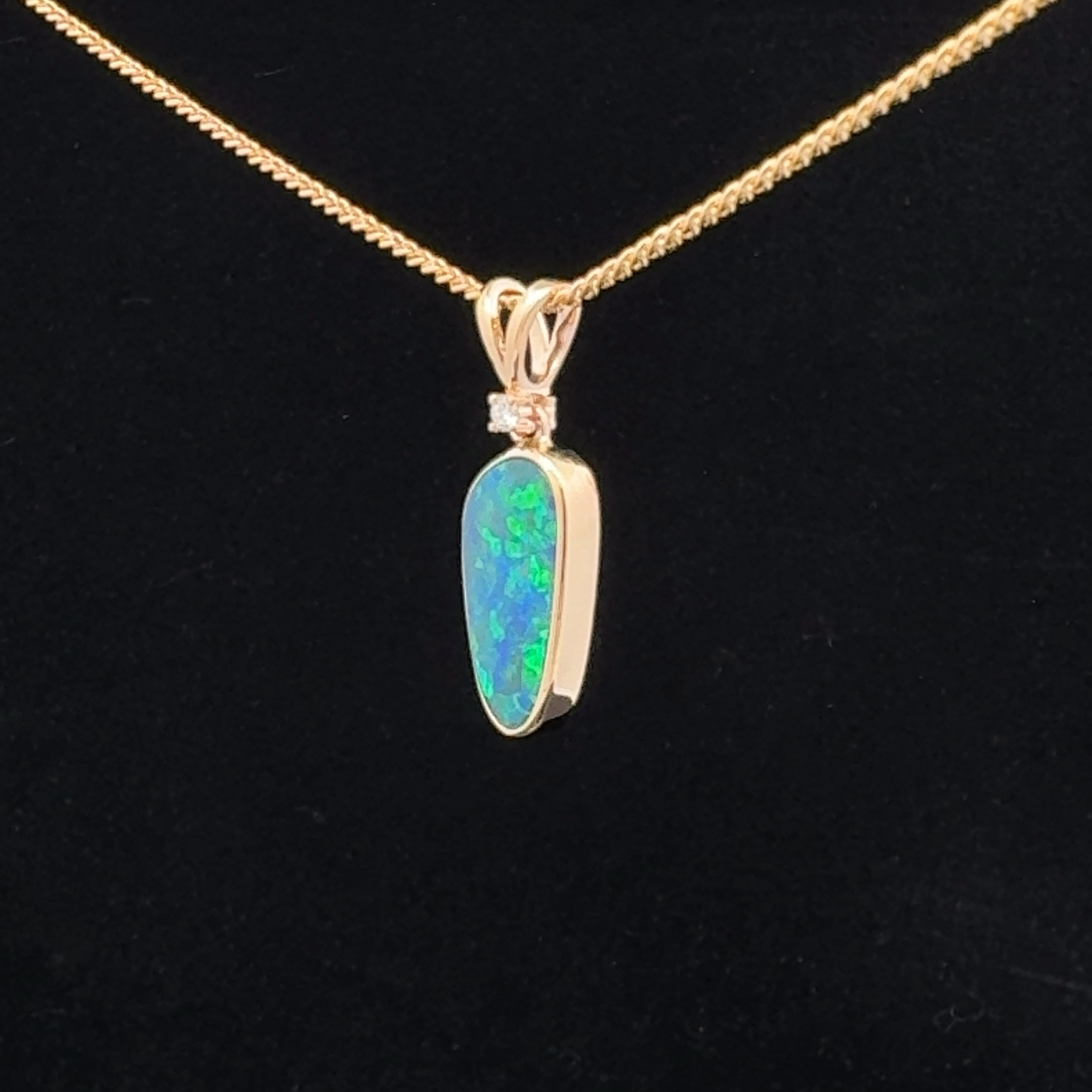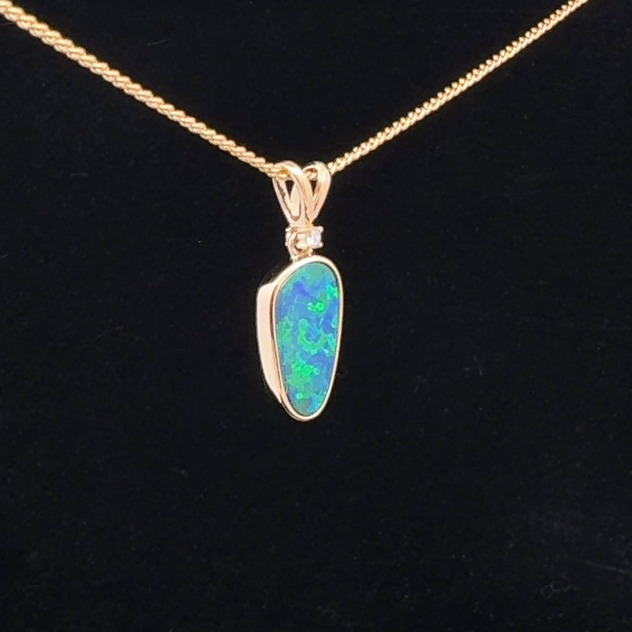 14K Yellow Gold Bezel Set Doublet Opal Pendant on a decorative Bail with Diamond feature