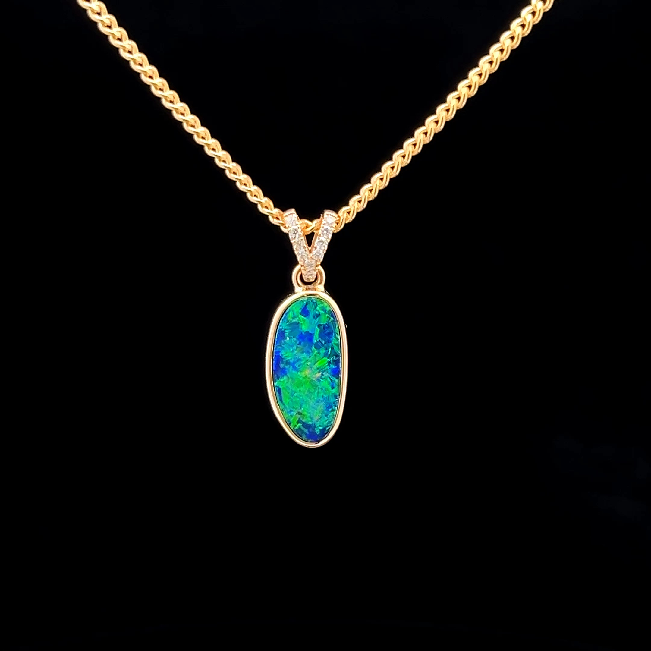 14K Yellow Gold Bezel Set Doublet Opal Pendant on a decorative Bail with Diamond feature