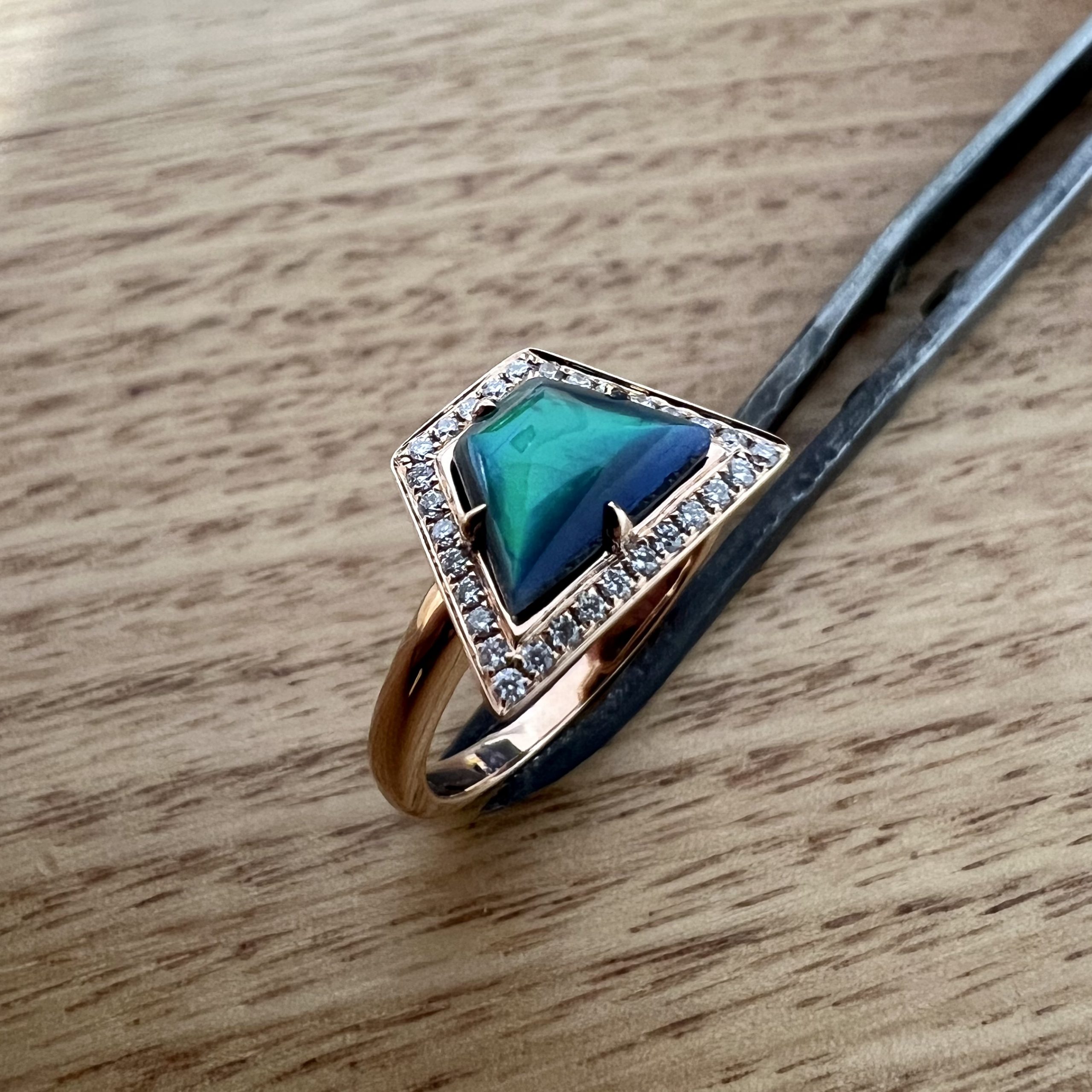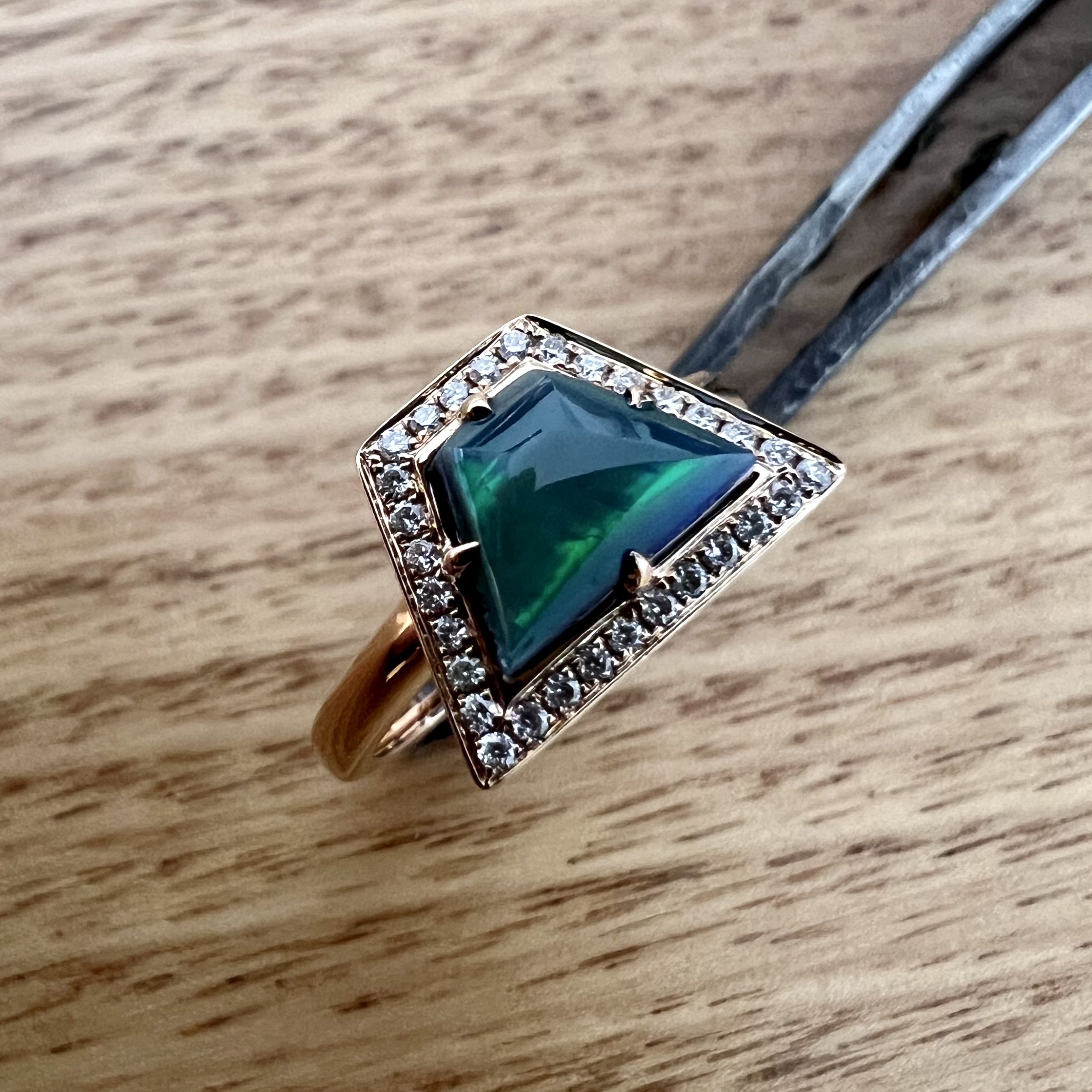 Solid trapezoid- shaped Lightning Ridge Black Opal set in 18K Rose Gold with a Diamond Halo