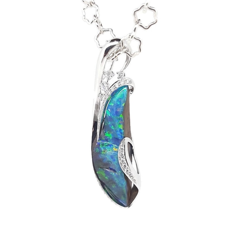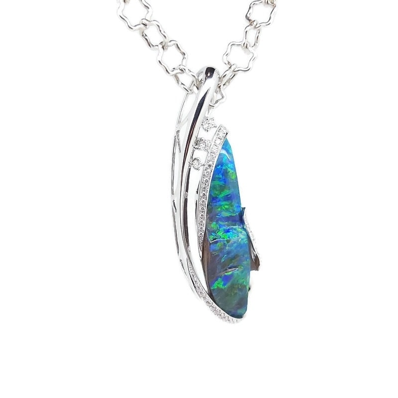 18K White Gold Solid Queensland Boulder Opal and Diamond Pendant