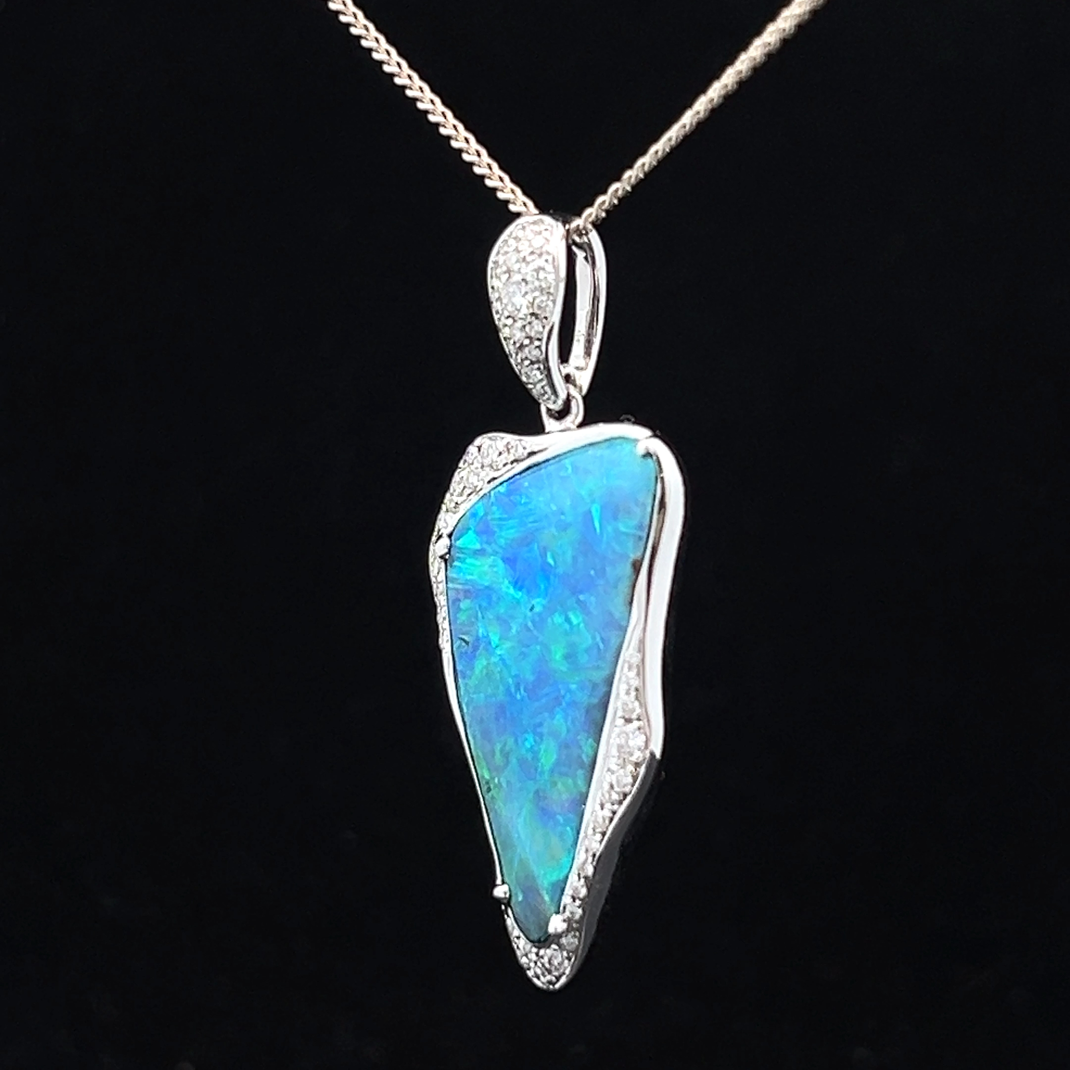 18K White Gold Solid Boulder Opal and Diamond Pendant