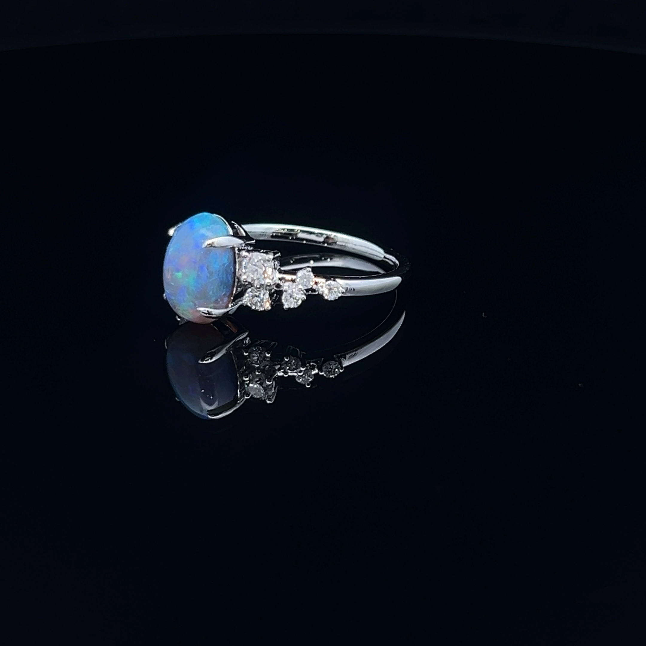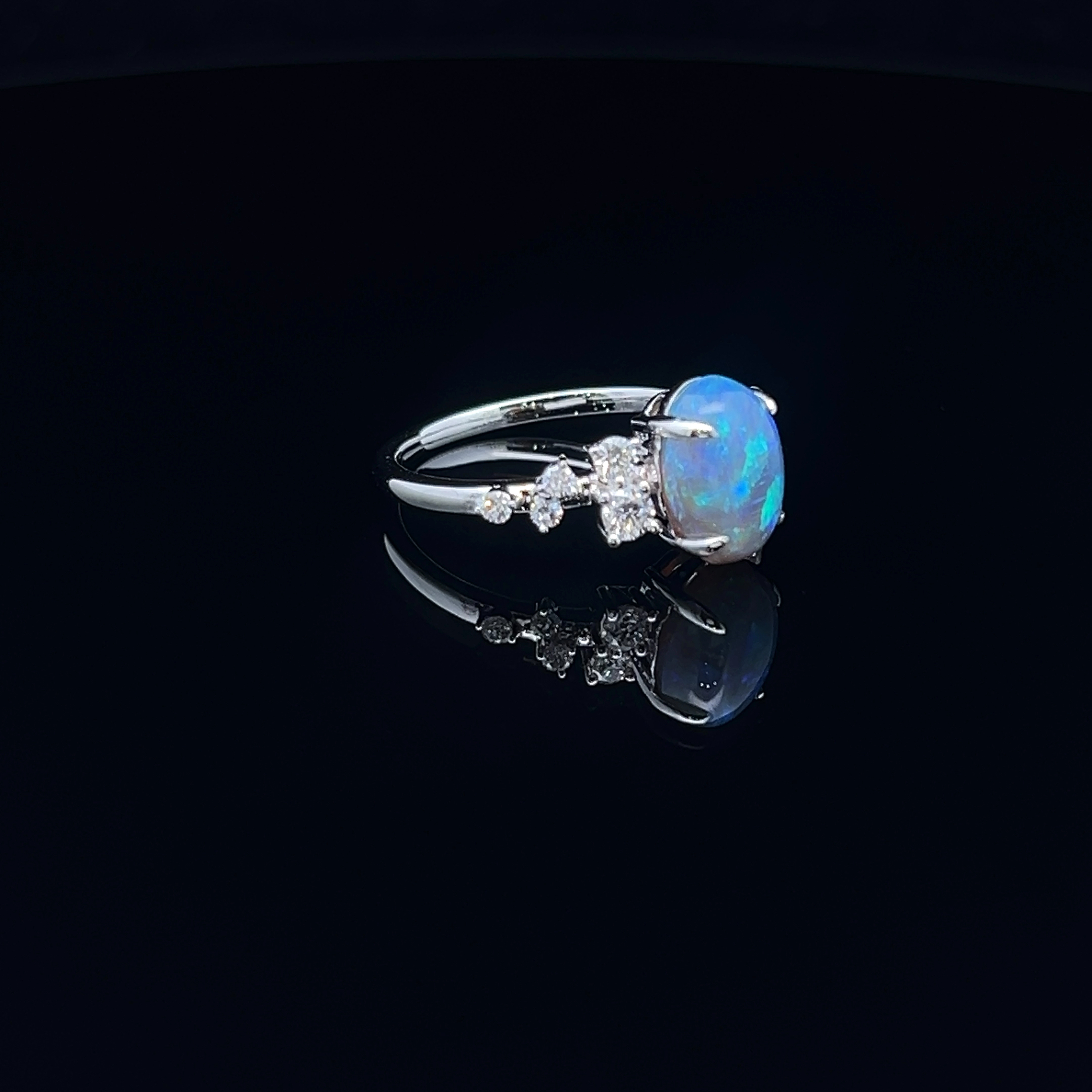 Solid Lightning Ridge Crystal Opal on an 18K White Gold Band with various sized Diamonds