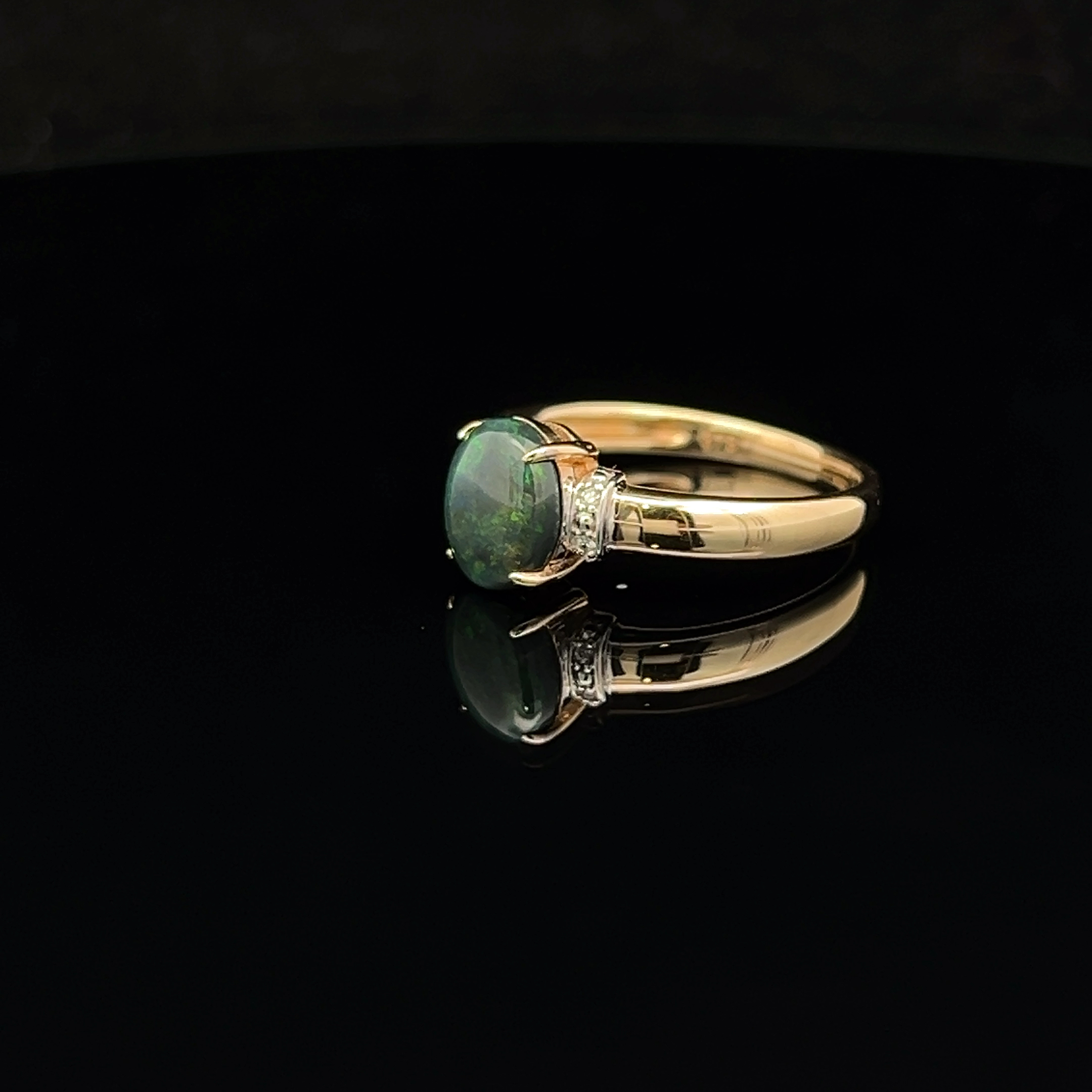 Solid Oval-cut Black Opal set in 18K Yellow Gold with Diamond feature