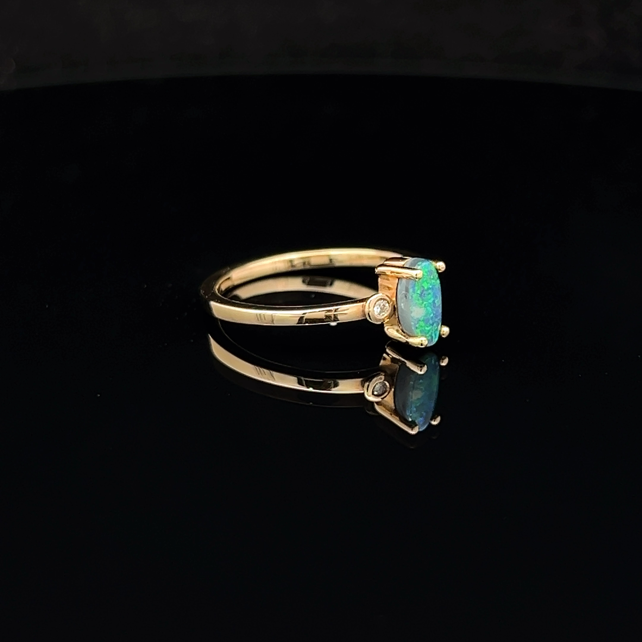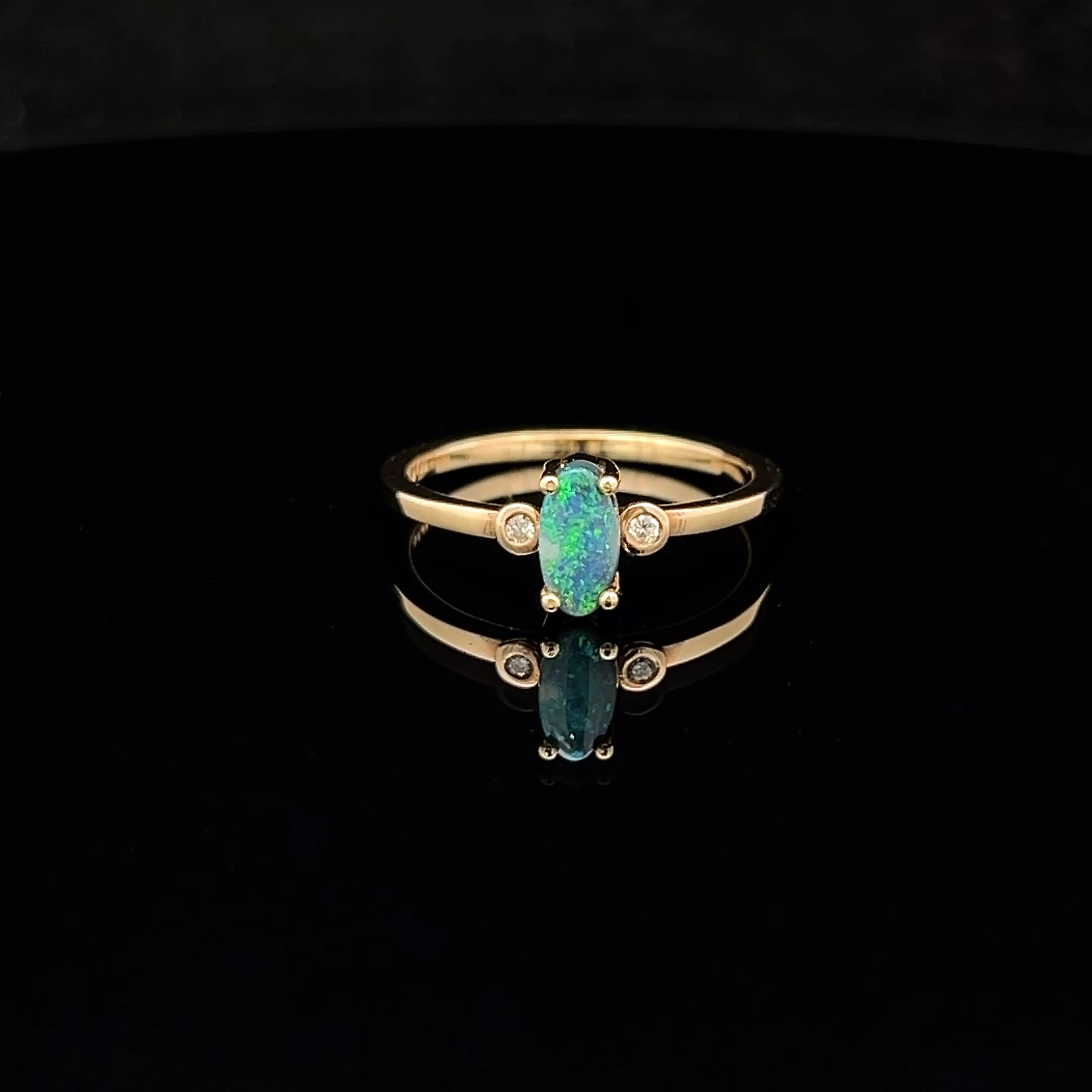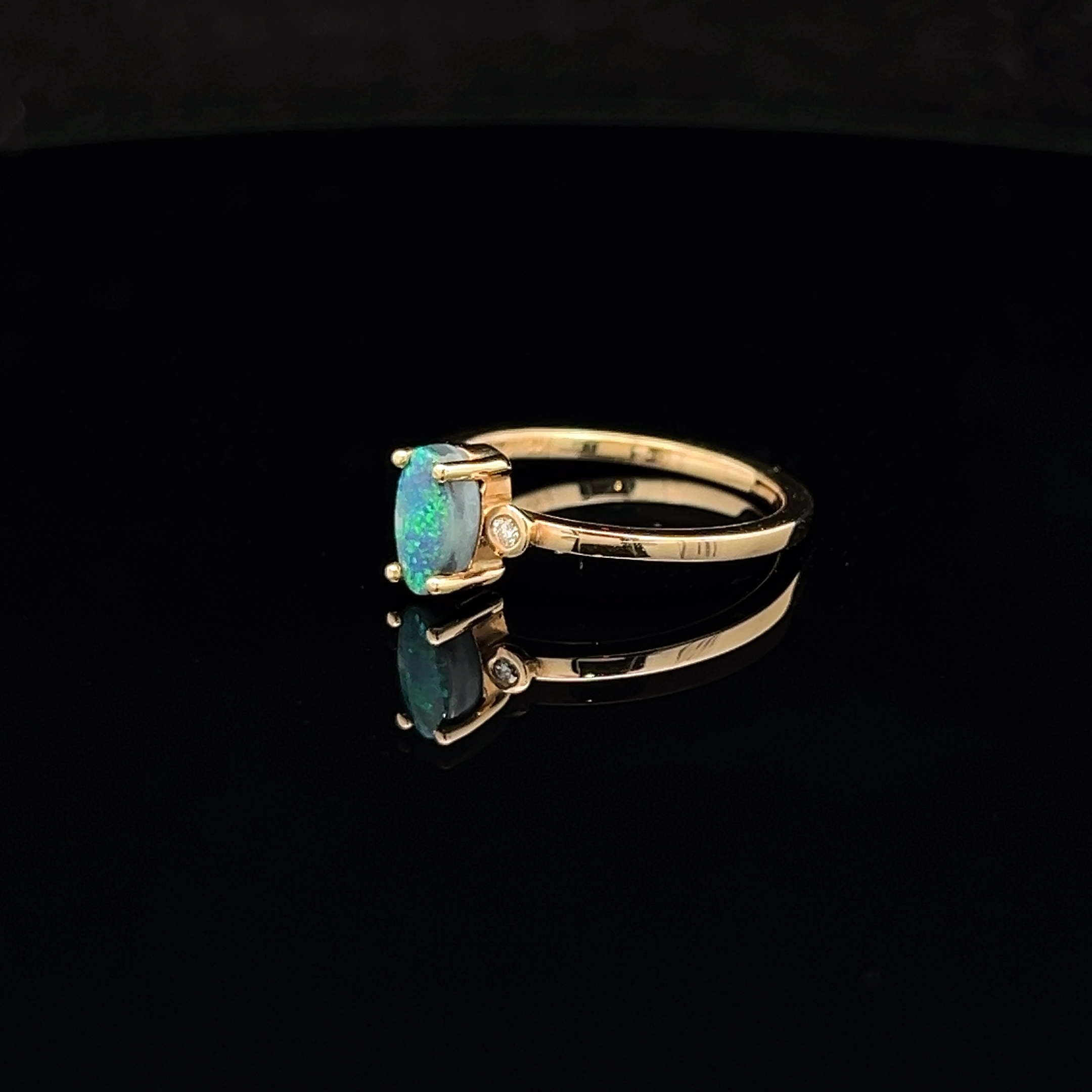 Solid Oval-cut Black Opal set in 18K Yellow Gold accentuated with a Diamond either side