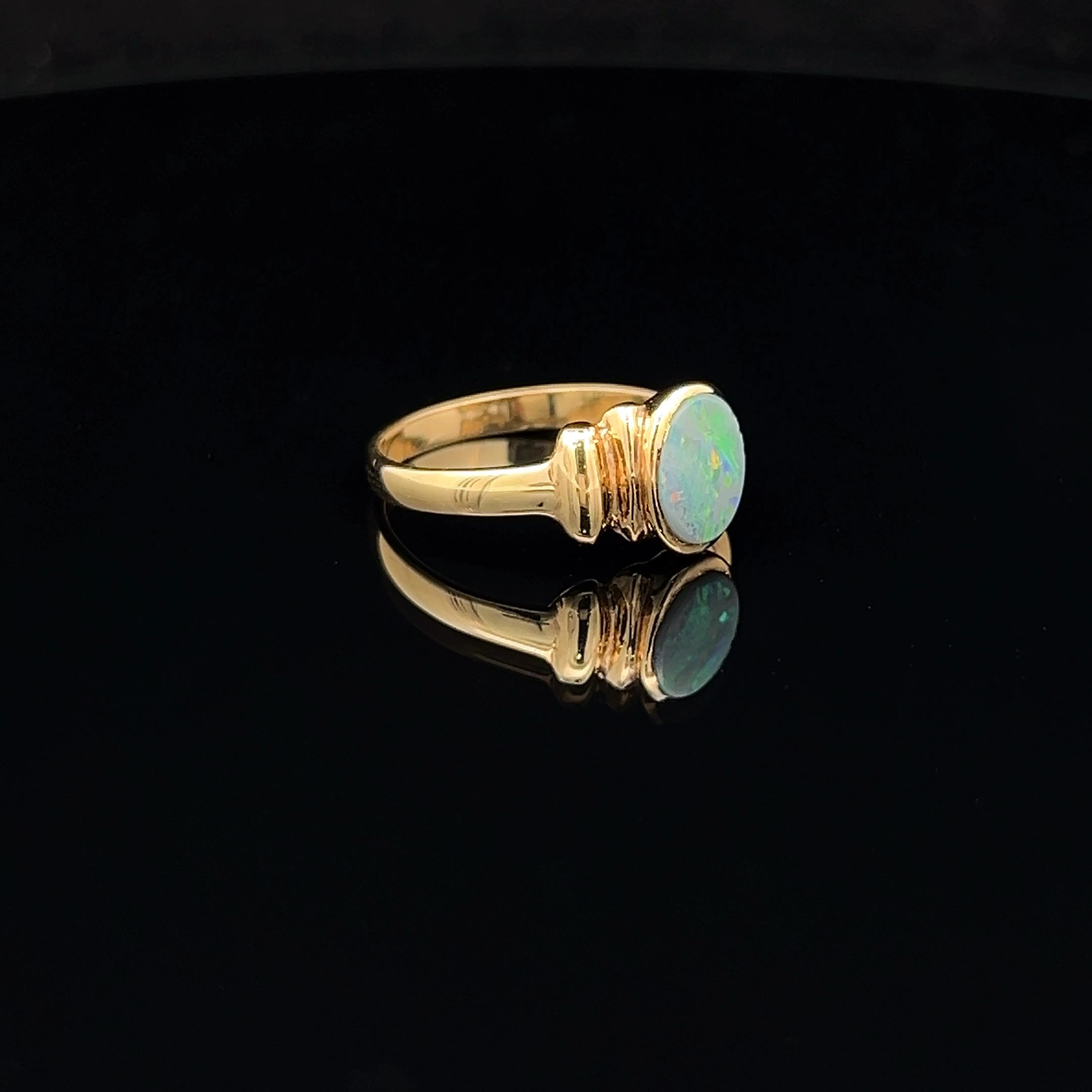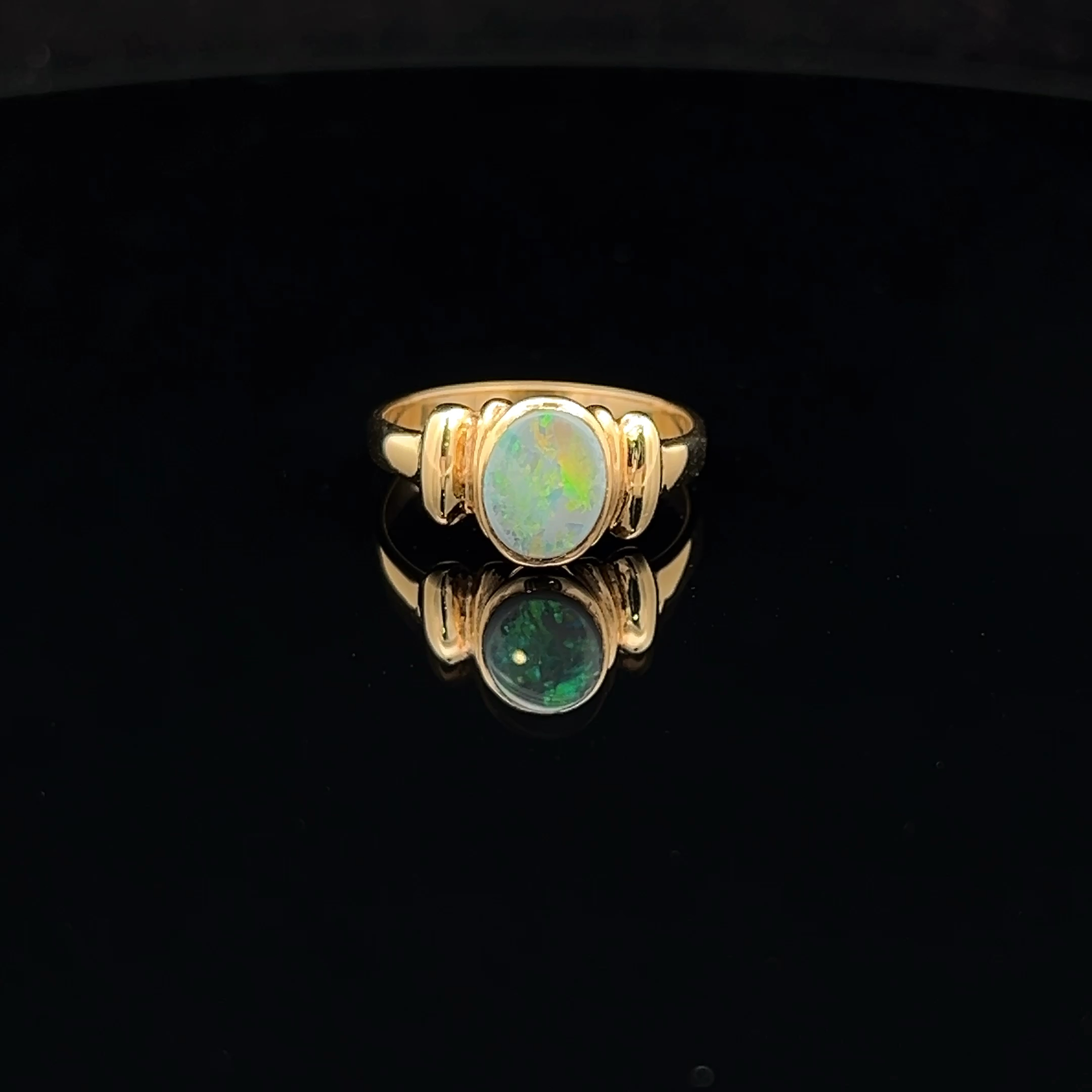 Solid Oval-cut Black Opal set in an intricate 18K Yellow Gold Band