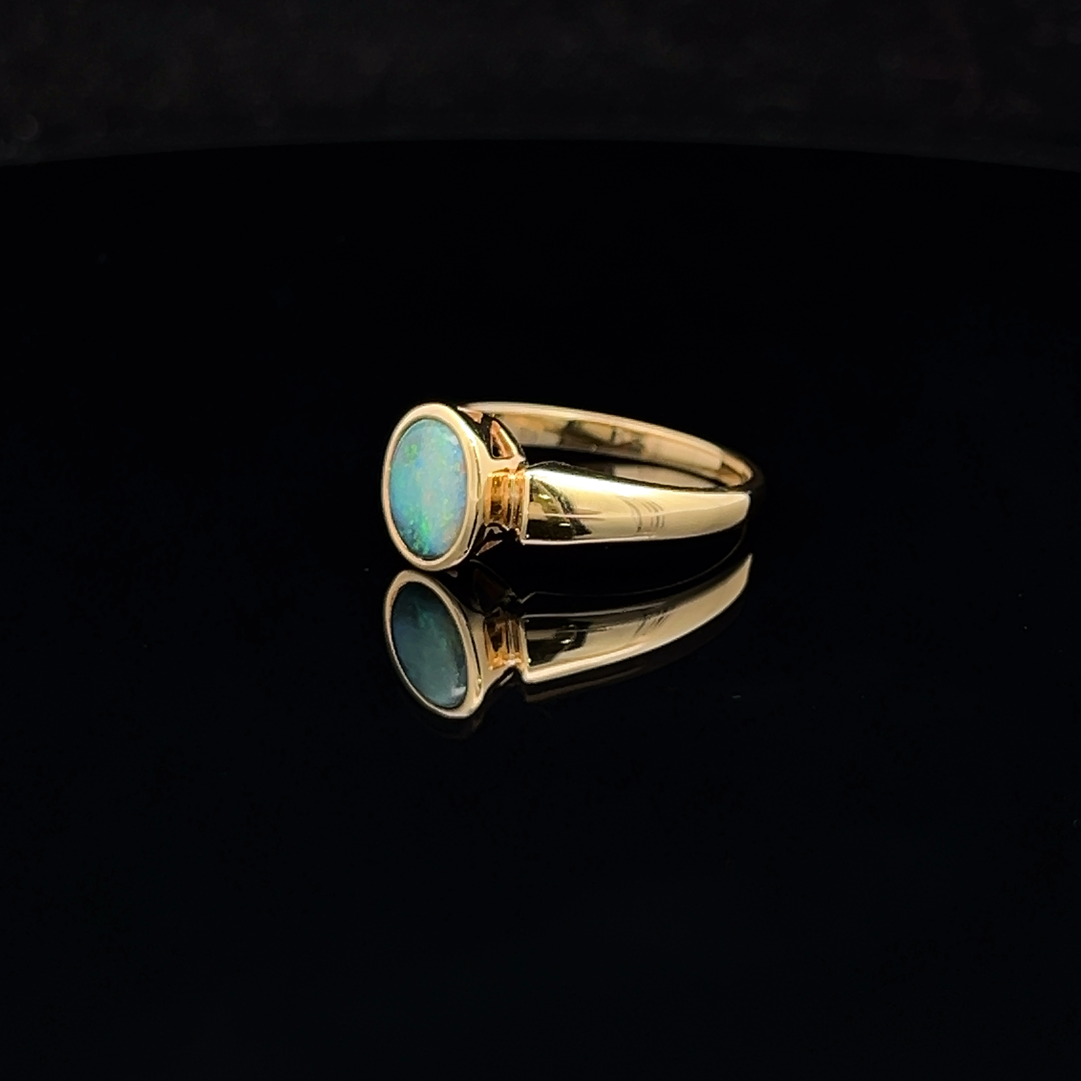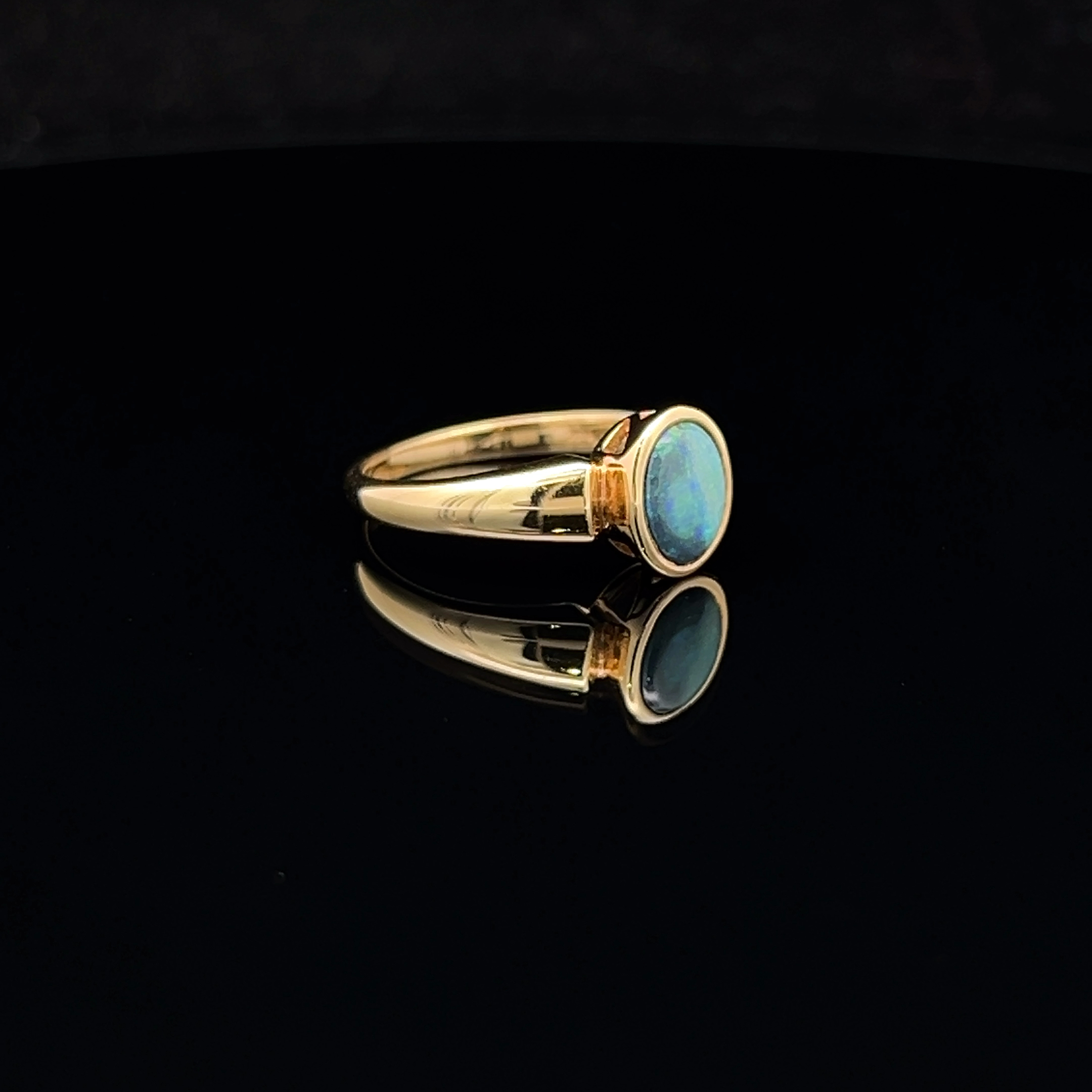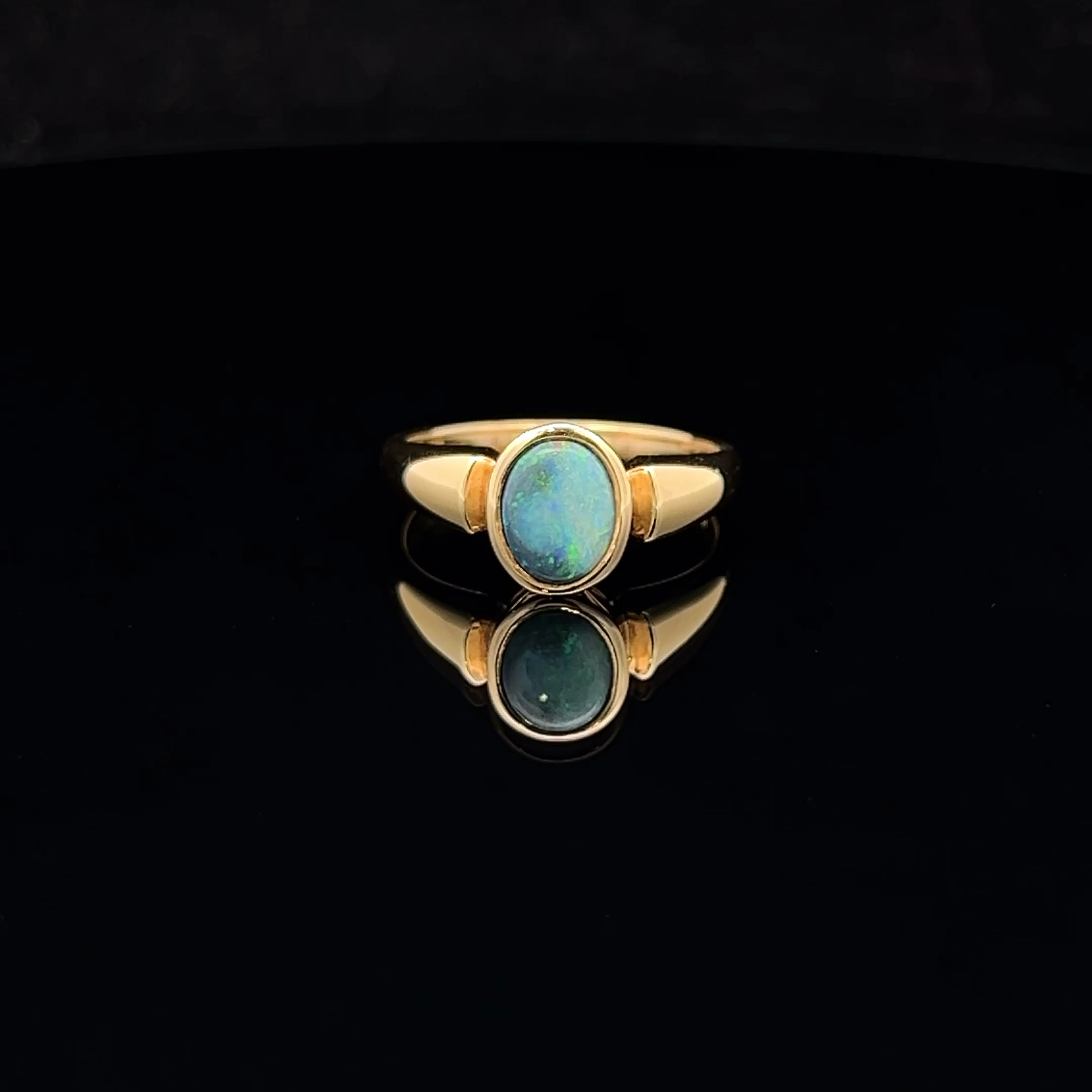 Solid Oval-cut Black Opal set in an intricate 18K Yellow Gold Band