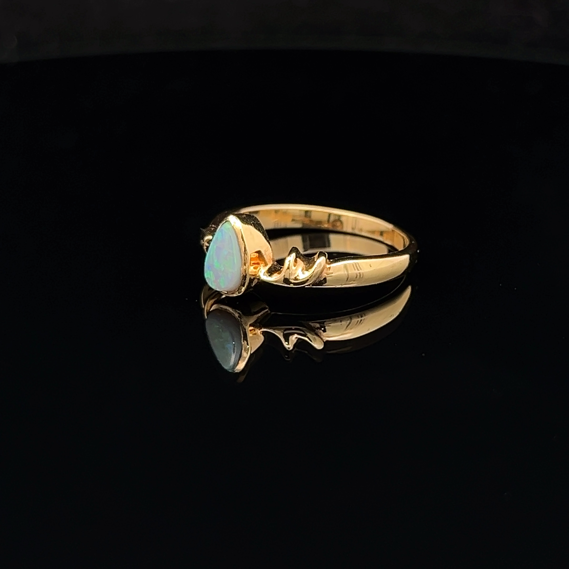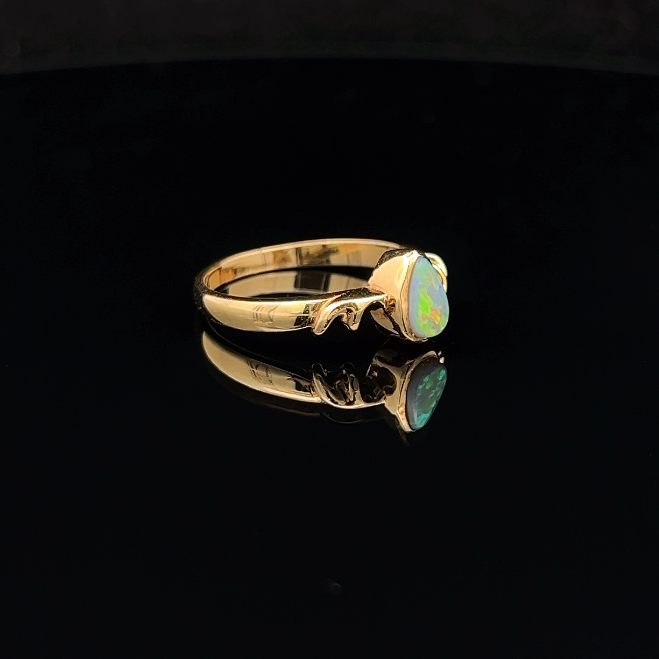 Solid Pear-cut Black Opal set in an intricate 18K Yellow Gold Band