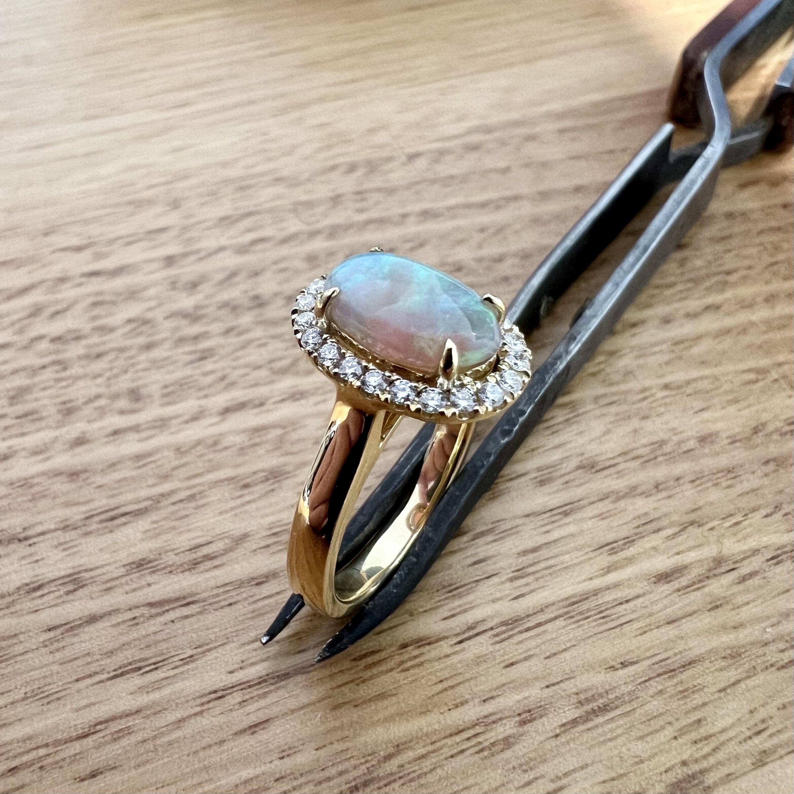 18K Yellow Gold Solid Crystal Opal & Diamond Halo Engagement Ring