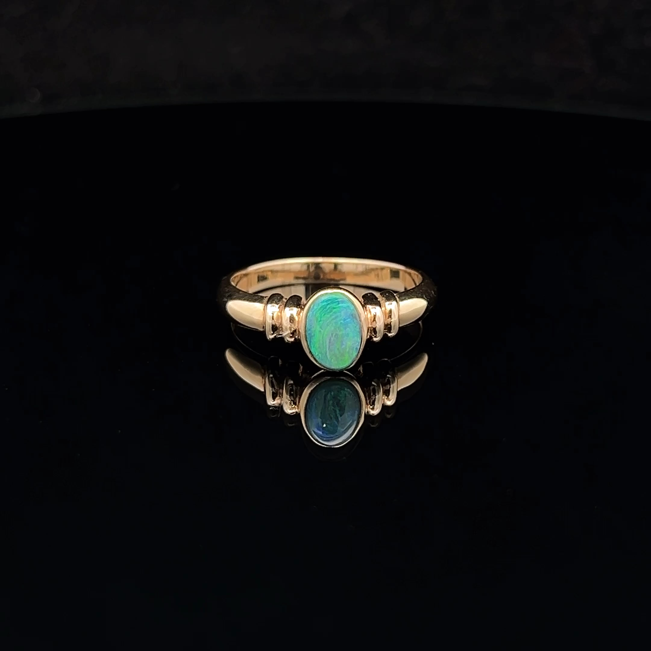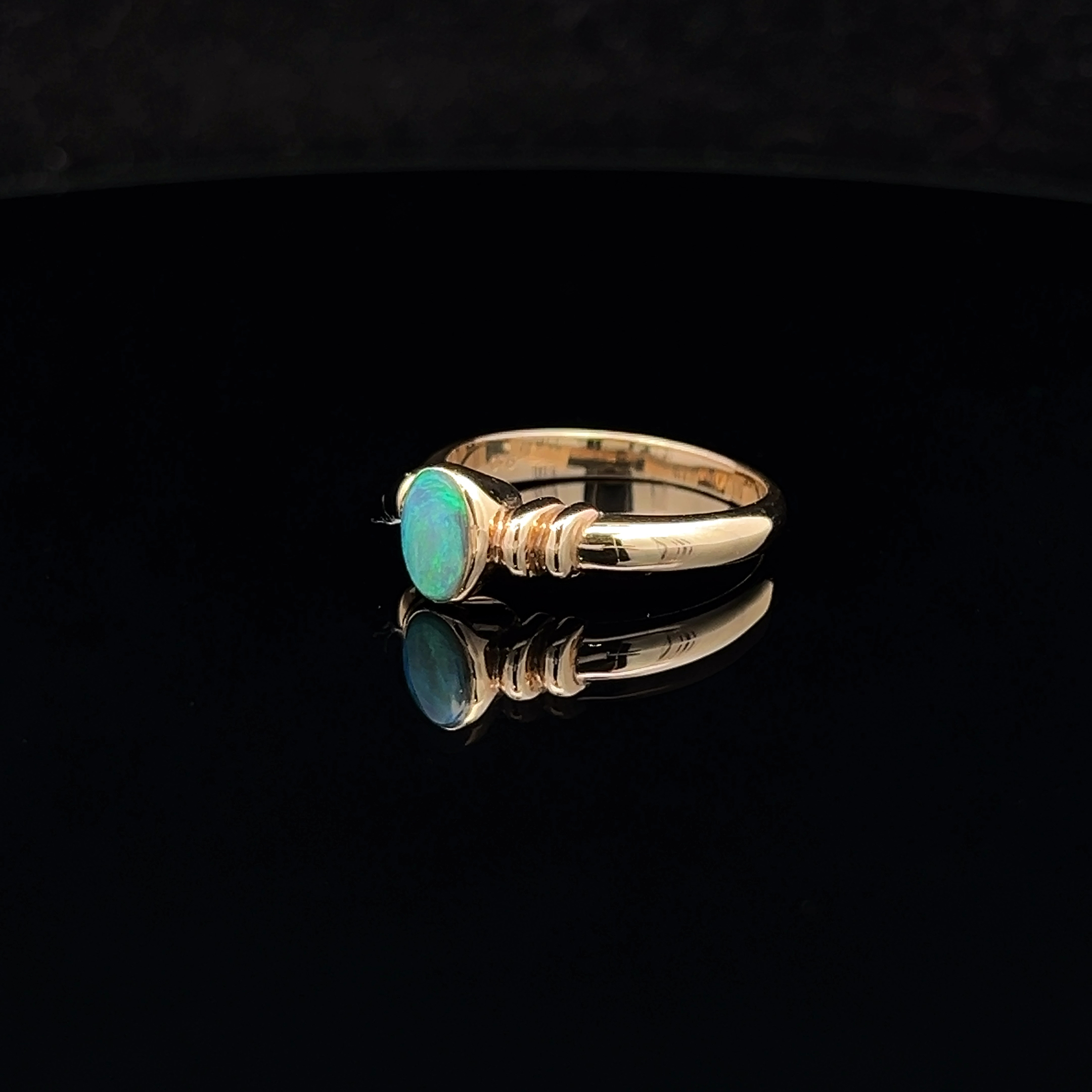 Solid Oval-cut Black Opal set in an intricate 9K Yellow Gold Band