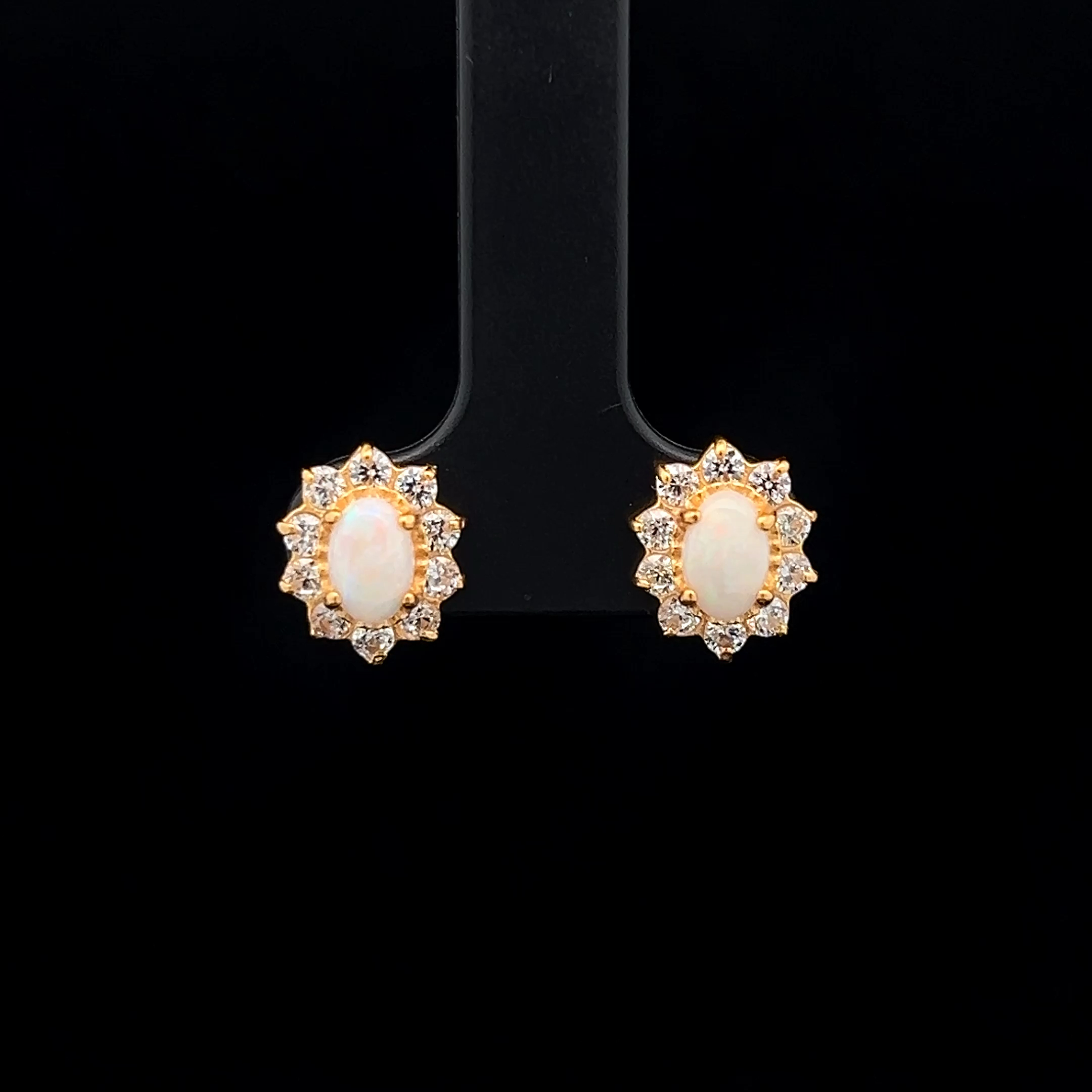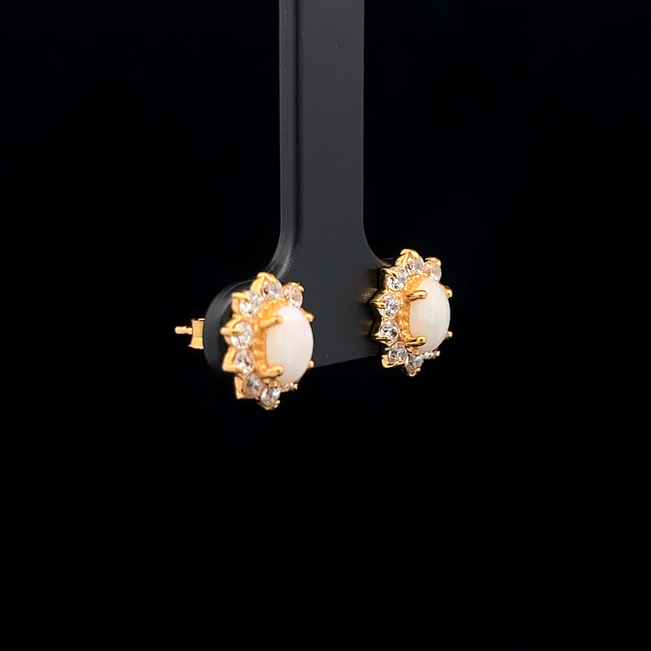 South Australian Oval Shaped Solid Light Opal Stud Earrings, surrounded by Cubic Zirconias and set in Gold Plated Sterling Silver