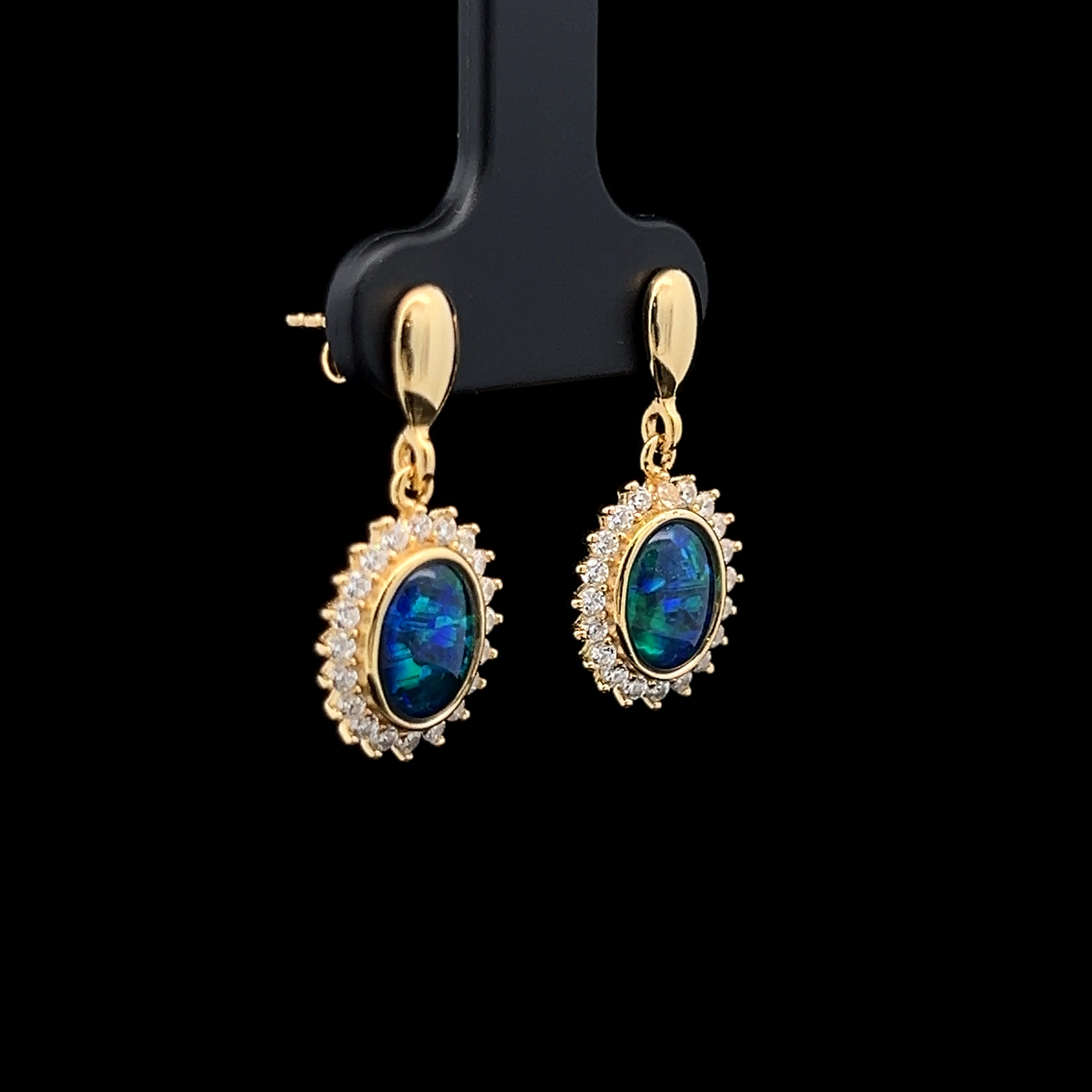 Gem Quality Australian Oval Shaped Triplet Opal set in Gold Plated Sterling Silver Drop Earrings Surrounded with Cubic Zirconias