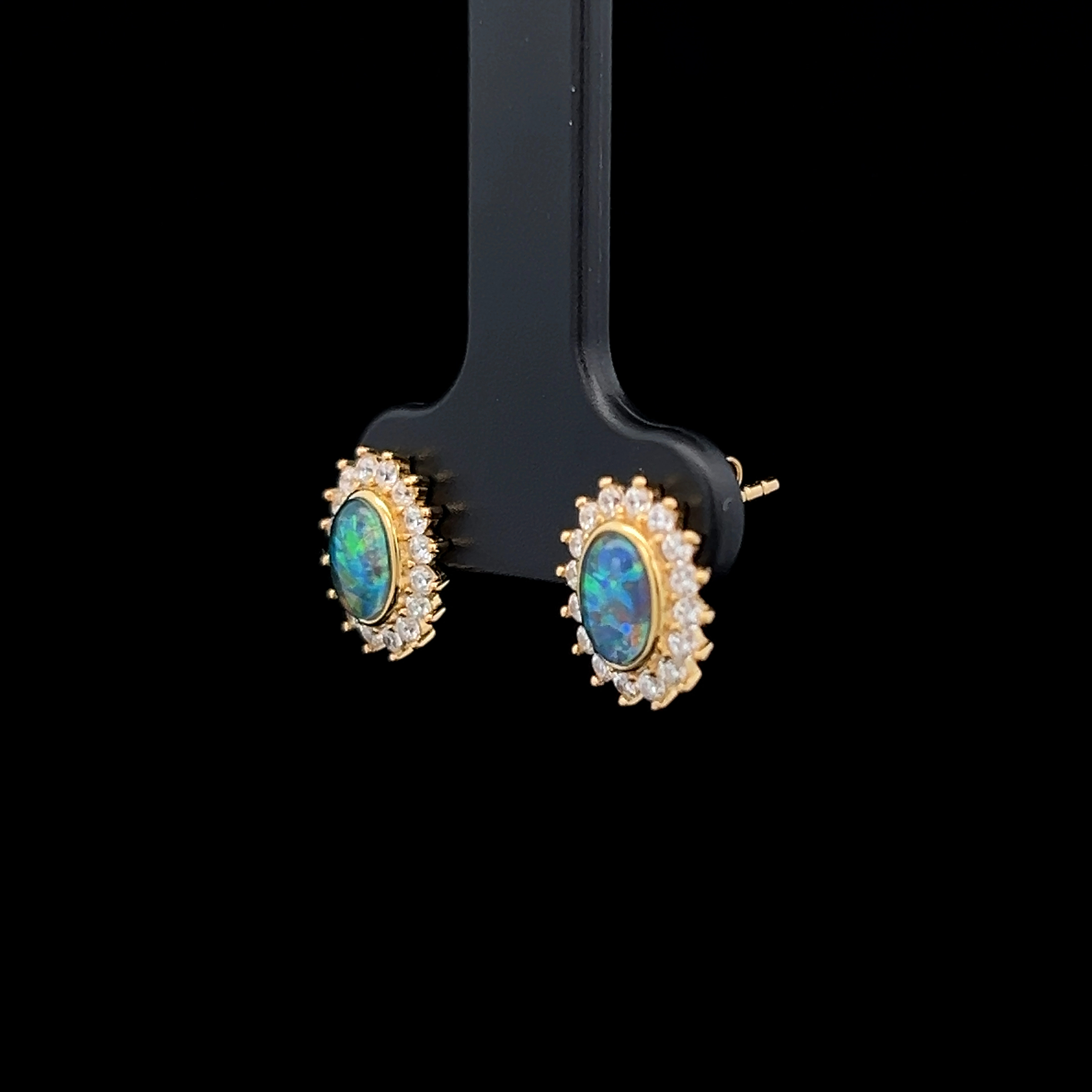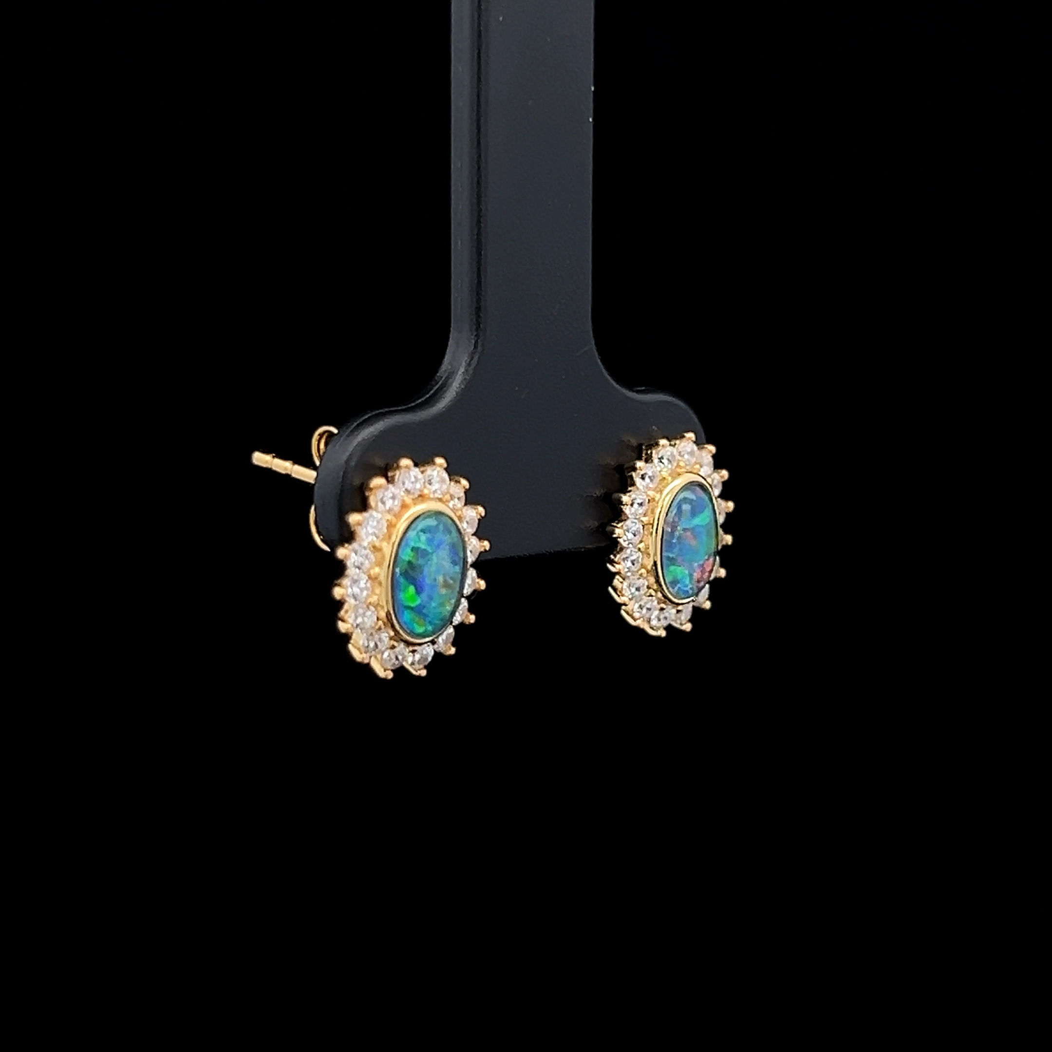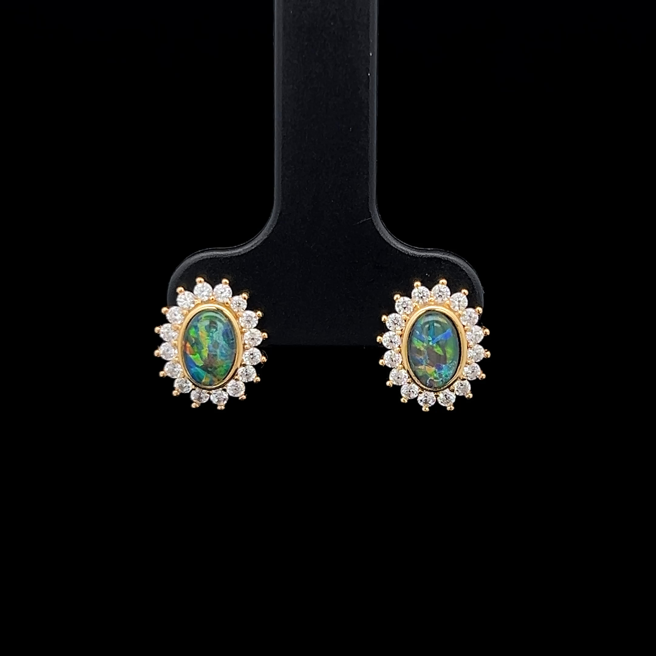 Gem Quality Australian Oval Shaped Triplet Opal Surrounded by Cubic Zirconias set in Gold Plated Sterling Silver Earrings