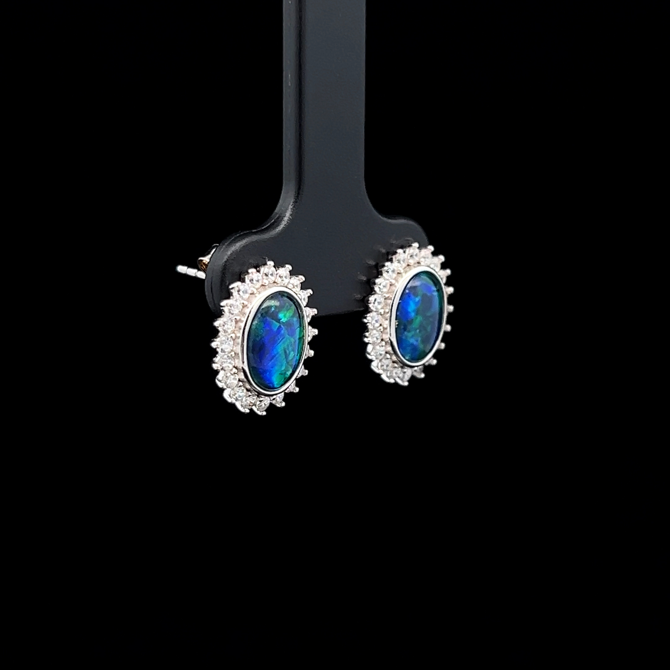 Gem Quality Australian Oval Shaped Triplet Opal Surrounded by Cubic Zirconias set in Sterling Silver Earrings